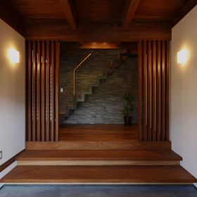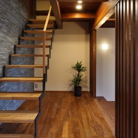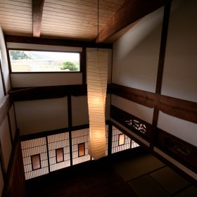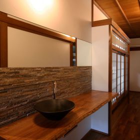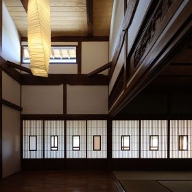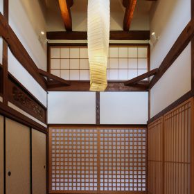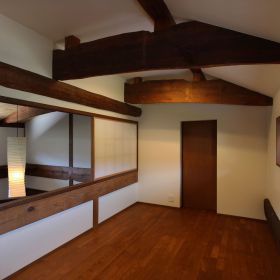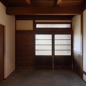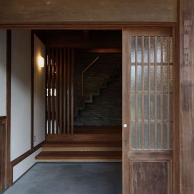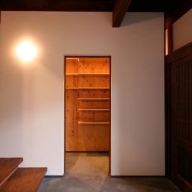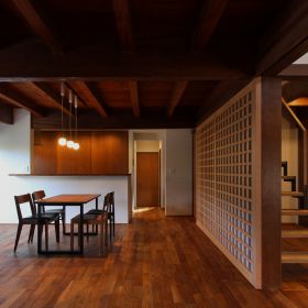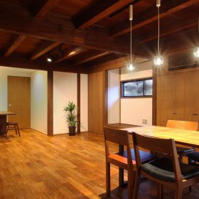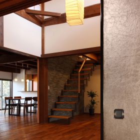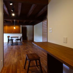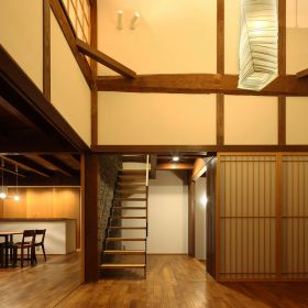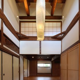 親族が集う和室の一部屋は、そのまま残す計画とし記憶の継承にも配慮しながら、それに続く板の間の部分には吹抜を設けたことで、上部から柔らかな光が建物の奥にも届くようになっています。この家を受け継がれた若いご夫妻が暮らすにあたり、来客時や日常の生活動線を打合せの中で何度も見直し新たに組立てながら、家族の気配が優しくつながる距離感にも配慮しています。淡路島のこの風景の中で存在感のある『佇まい』を受け継ぎながら、現代の住まいとしての心地良さを実現した古民家の改修となっています。
