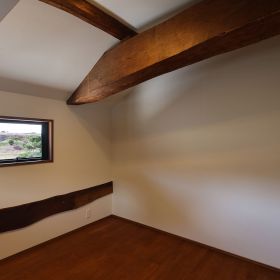 改修前の写真 (左から順に外観・玄関・小屋裏)