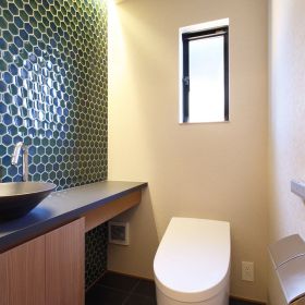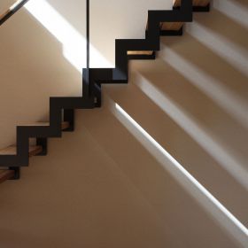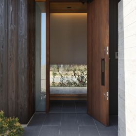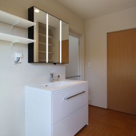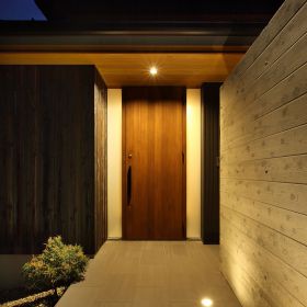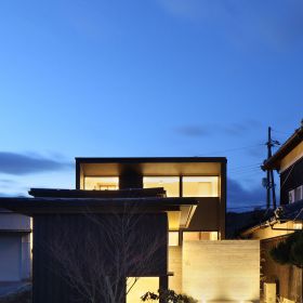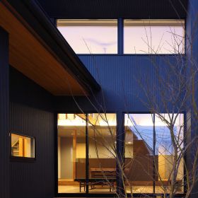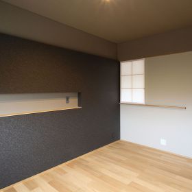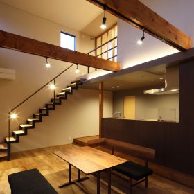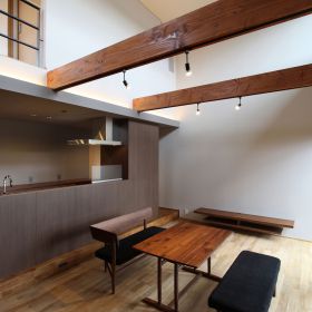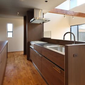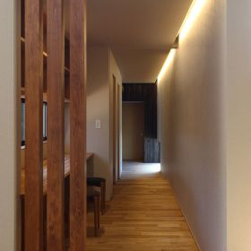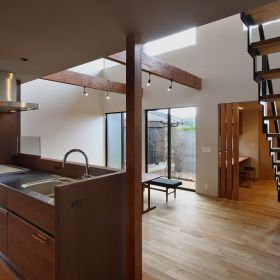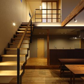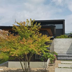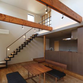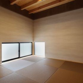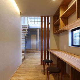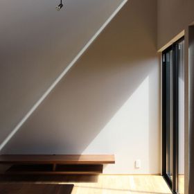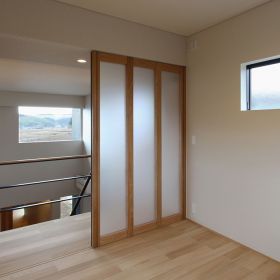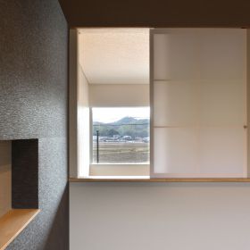 「視線」「眺望」「採光」「通風」等のそれぞれの要素に配慮し、ご実家側とは繋がりながら、見通しの良い周辺環境に対しては緩やかに閉じる。そして、この地ならではの故郷の風景を豊かに感じることできる住まい。元々、田畑の時にあった敷地高低差をそのまま建物内部へと取込み、奥へと進むごとに床レベルを変化させていくことで、細長い敷地に建つ『風景の舎』の内部空間に様々な表情を持たせています。