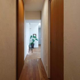 アプローチ・玄関ホールと緑を感じながら、家の奥へと入ると、やわらかな『光』と『緑』に包まれる空間が広がります。