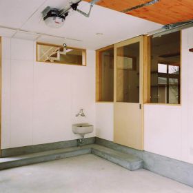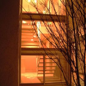 建物は、『二つの閉じた箱』とそれらをつなぐ『開かれた箱』というシンプルな形の組合せとし、愛車の姿・互いの気配・光・風は『開かれた箱』と中庭を介して交差、2階からも愛車の姿が確認でき、奥様もご主人の気配を感じられる空間構成となっています。
