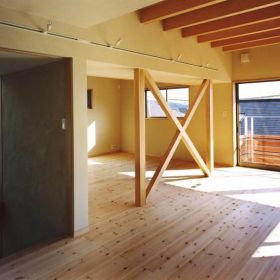 浴室位置は、北側に残る自然の風景を眺めながらお風呂に入れるように計画し、週末の何気ないひととき、『家で過ごす時間の楽しみ』ということに重点をおいています。忙しいご夫婦の毎日の生活パターンなどを考慮し、水まわりの動線はできるだけコンパクトにまとめています。また、2階は今後の家族構成の変化に対応できるようフレキシブルでオープンな間取りとし、子供が小さい間はリビングの一部に子供の遊ぶスペースがあるという使い方ができるように考えています。