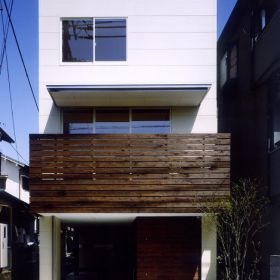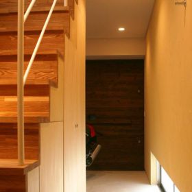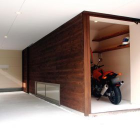 ご主人の趣味のバイク2台・車2台を包容すると共に、家族の気配がわかる様3層が立体的につながる空間構成の家を提案。
