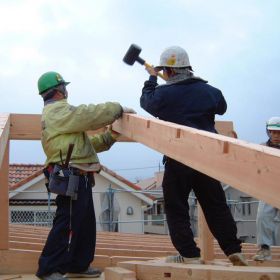 棟上げの当日は、大工のお父様の指導のもと、クライアント自身も急遽、梁を組むのに参加しました。