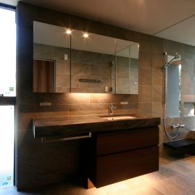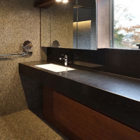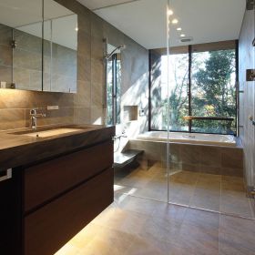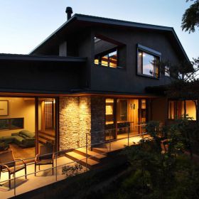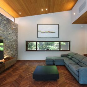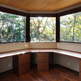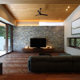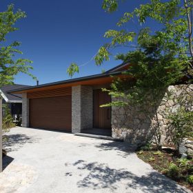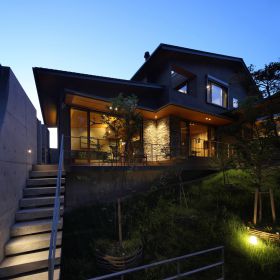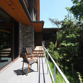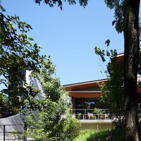 敷地の一部である森の既存樹木・斜面地・そして周辺隣地など・・・住宅としての機能はもとより周辺環境との調和・共存など、周囲との関係性を慎重に読み解きながら計画した建物です。「建築物」「庭」「自然の森」「敷地高低差」を手掛かりとして、距離感・ボリューム感の検討を繰り返しながら、建物はできるだけ低く抑え、ボリュームを分散させた計画としています。