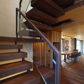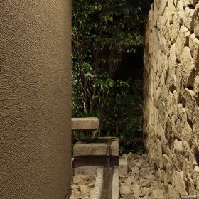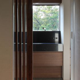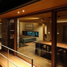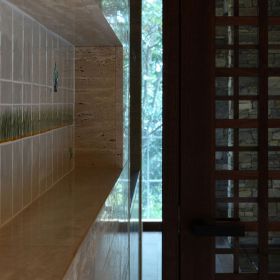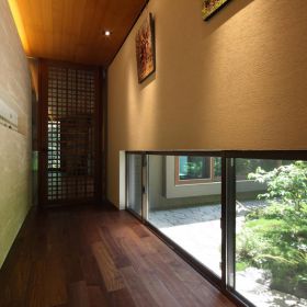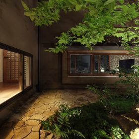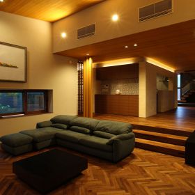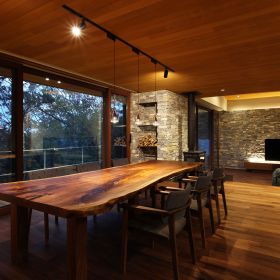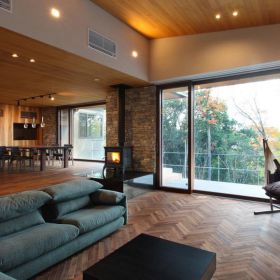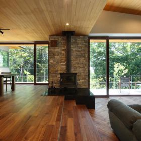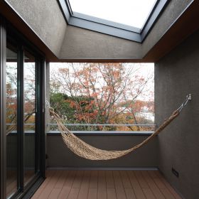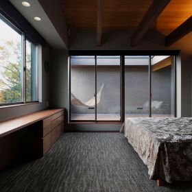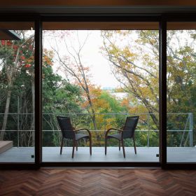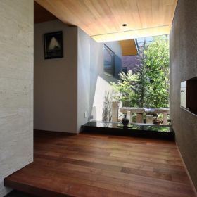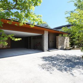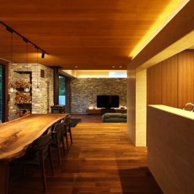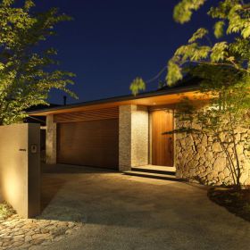 アプローチ側の前庭-中庭-森へと・・・徐々に深い緑に包まれ、四季折々に様々な表情の自然を感じながら過ごす場所『森と暮らす家』。玄関の扉を開け、廊下から森側へ歩みを進め辿り着く先は、森と一体となる静かな空間。風のそよぎ、木漏れ日、虫の音、野鳥のさえずり、陽の光、月明りに照らされる樹々の揺らめき・・・ここで過ごす日々の時間が、ゆったりと流れ豊かな時を楽しめる場所となるように・・・