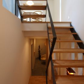 傾斜地である敷地の特性を生かし、「中庭を囲むスキップフロア」を提案しました。各床レベルからの視線・眺望を意識的に操作した結果、内から外へと開放される住宅になっています。