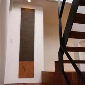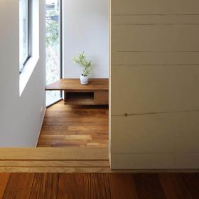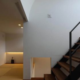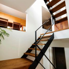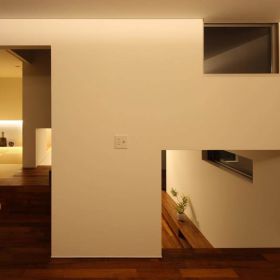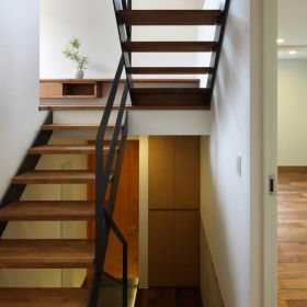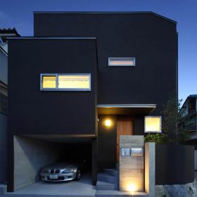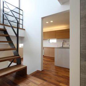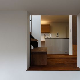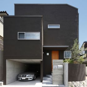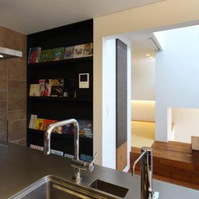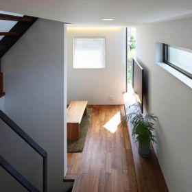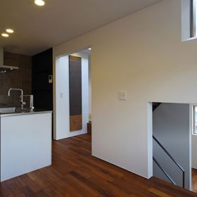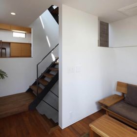 現況の敷地高低差(約2m)を利用しながら、ご家族4人+愛車1台で、楽しく暮らせる住まいの計画。約17坪の敷地の中に、7層のスキップフロアを配し、大小さまざまな居場所を設けています。