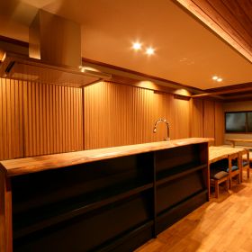 倉敷川に面する趣きある立地に築40年あまりの住宅。クライアントのご実家を祖母・両親・子世帯と3世帯住宅へ変える大規模な戸建のリノベーション。2世帯で同居するということと合わせて、季節ごとのご家族行事の時に、独立して離れた家族も『みんなが揃って一つの食卓を囲めるように・・・』そういったキーワードからスタートした家づくりでした。別々に暮らしていた単世帯から多世帯での暮らしへと大きく変貌させる改修。それぞれのご家族の必要十分な空間を用意しようとすると空間的にどうしても足りない。駐車スペースを考慮すると増築することも難しいという条件の中で、大家族での住居へ対応できるように、それぞれのご家族の日常の生活スタイル、動線などの見直しを行いながら、世帯ごとの空間分けをしゾーニングを行いました。住まうご家族それぞれに活動時間も異なるため生活音の軽減、動線の交錯に配慮しながら、共用する部分・別々にする部分と打合せを重ねながら一つ一つ整理していきました。一つの屋根の下、多世帯が心地良く生活できる場の創生とご家族らしく暮らすためのリノベーション。一部、住みながらの改修のため写真が少ないですが、写真は、ご家族の集まるダイニング。料理する人も中心にいながら、もてなせるオープンなキッチンに低めのテーブルとソファーを組合せ、小上がりの和室へとつながる。大人も小さな子供達も一緒に大勢が集まって食卓を囲むひと時を楽しむ『集いの舎』の象徴的な空間です。