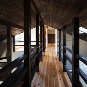子世帯のリビング上部は、ファミリースペース(セカンドリビング)となっており、書斎コーナーや大きな座卓を囲んで工作をしたり、絵本を読んだりと、思い思いに好きな時間を過ごしながらも、互いの気配が感じられる空間になりました。既存棟とつながるブリッジの欄間は、和室にあったものを再利用しています。